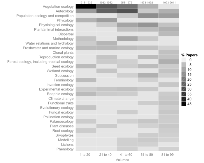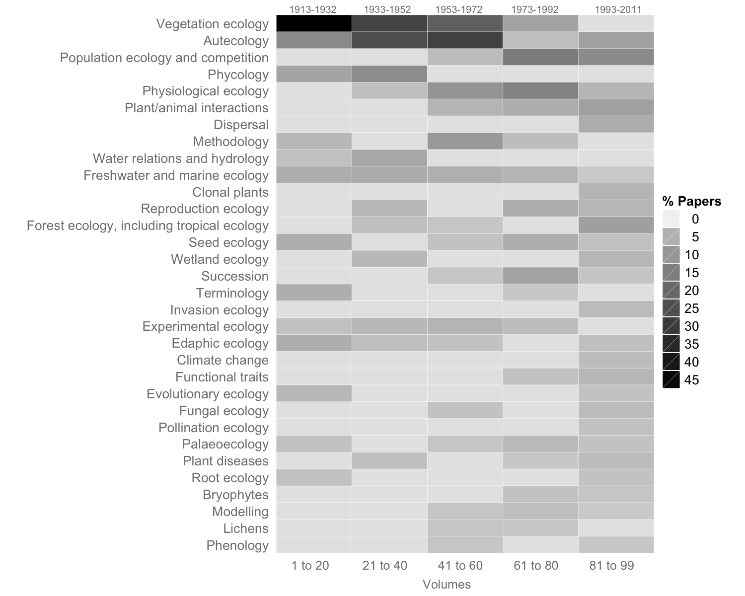 In the aforementioned paper they presented a table breaking down how papers were distributed across different fields of ecology over the past 100 years (or the first 100 volumes of the Journal).