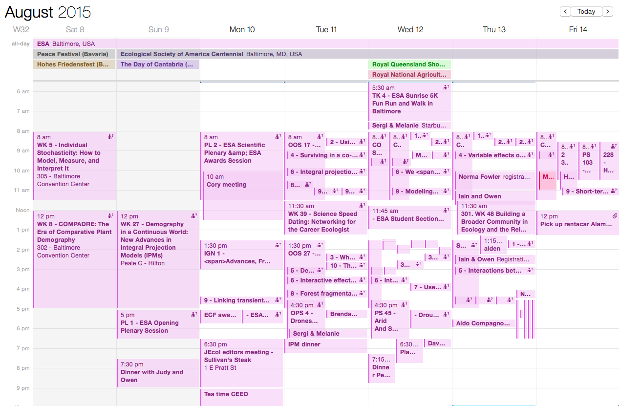 The annual meeting of the Ecological Society of America took place a bit over a week ago (Aug 8-14th 2015) in the city of Baltimore, MD. The centennial of largest national ecological society in the world was no joke, and I can’t imagine how much work must have gone behind the scenes for the impeccable conference ESA pulled off, as usual, but this time with over 4,000 delegates. Once again, I initially approached this conference with a “less is more” philosophy… which I rather quickly had to trash as I started browsing online in the ESA conference personal scheduler app, realizing I wish I could produce ramets and send them to different co-occurring talks. This is what my week ended up looking like… pretty sure I wasn’t the only one, based on how many people I saw running from one room to another along that long corridor.