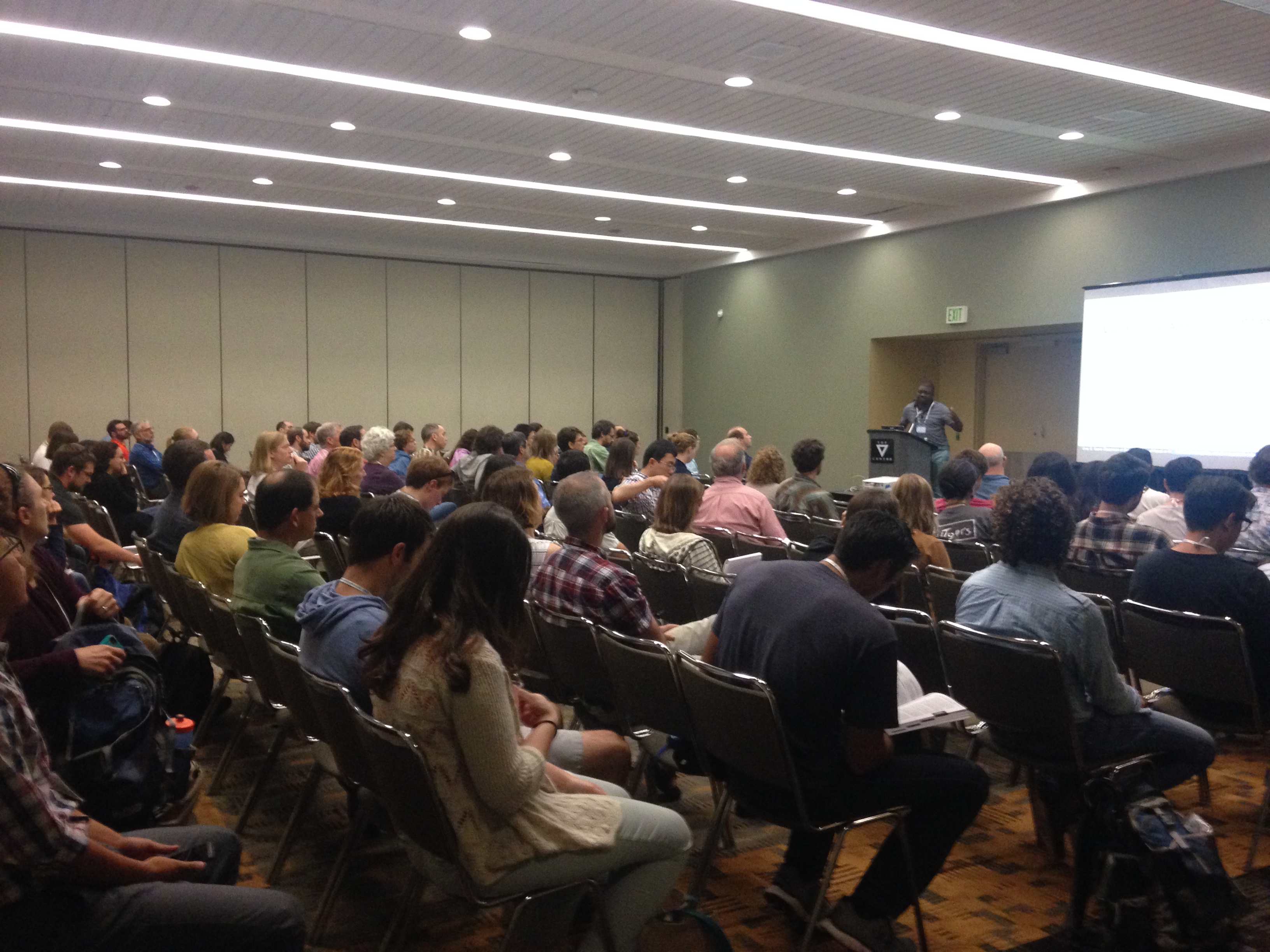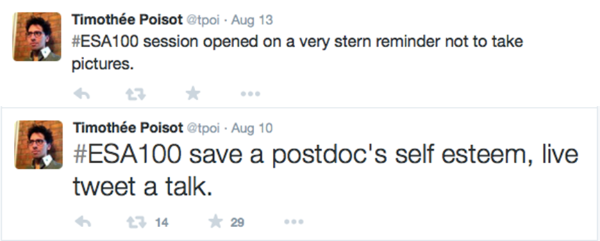 Final thought: I am not sure if this is now an ESA conference official policy, but in a series of organized oral sessions and symposia, the presider reminded the attendees that we should assume that the presenters would prefer not to have their presentations photographed or tweeted –unless otherwise stated by the speaker– and to act consequently by not taking photos or using Twitter… in my humble opinion**, this is a (huge) step backwards, and a rather anachronistic one, if we consider the recent foundation of the Open Science Section of the ESA. Just as with the principle of presumption of innocent, I humbly suggest that open-access should be the default assumption, unless the author explicitly asks not to take photos/tweet about the presentation. An opt-out option could be made available in the online abstract submission, or perhaps a symbol could be created to append to the talks so it is visually obvious to the attendees when not to photograph/tweet about the talk. After all, in most cases, why else would one present one’s research at the largest national ecological conference like ESA, but to get the word out?