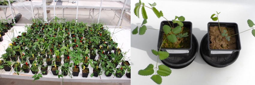 Left: One replicate block of the feedback experiment. Right: Sanguisorba officinalis planted at seedling stage but growing very differently in response to the soil treatments.