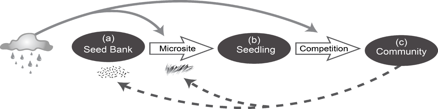 We paired our study with manipulative experiments that tested why previous-year rainfall may be critically important for annual plant communities. Our findings indicated that two major factors shifted species the following year: 1) the litter remaining at the end of the season and 2) the quantity of seeds produced by the species present. Thus, rainfall in one year stimulates the seed bank and regulates species competition for resources. The resulting community at the end of the season will affect the incoming community the following year, in part through the amount of seeds produced and the dry litter present as new seeds germinate (shown in the image below).