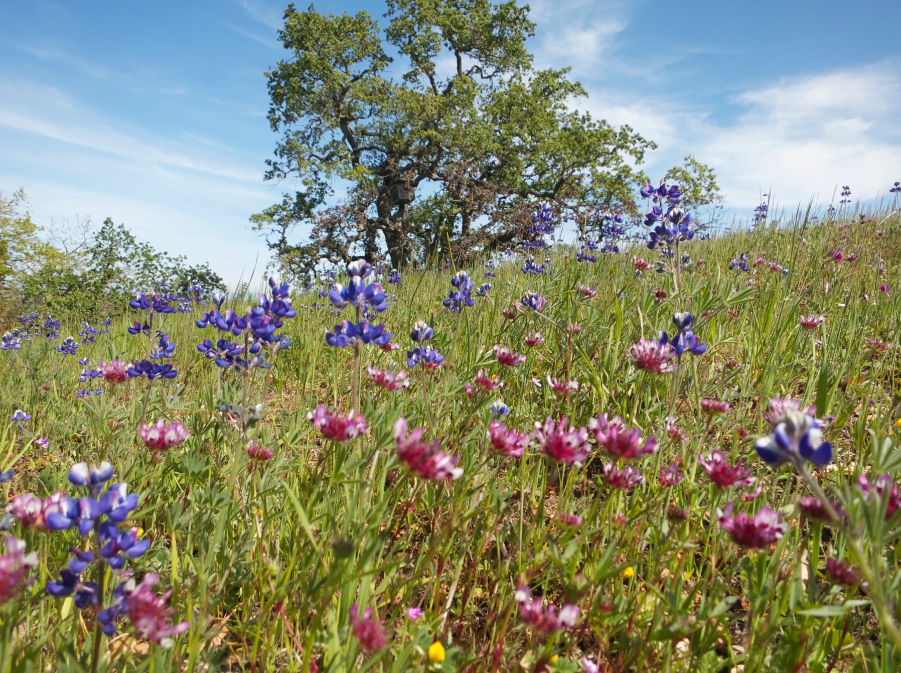 Annual wildflowers (with a valley oak in the background) also from the Bay Area, taken by Joan Dudney in 2013