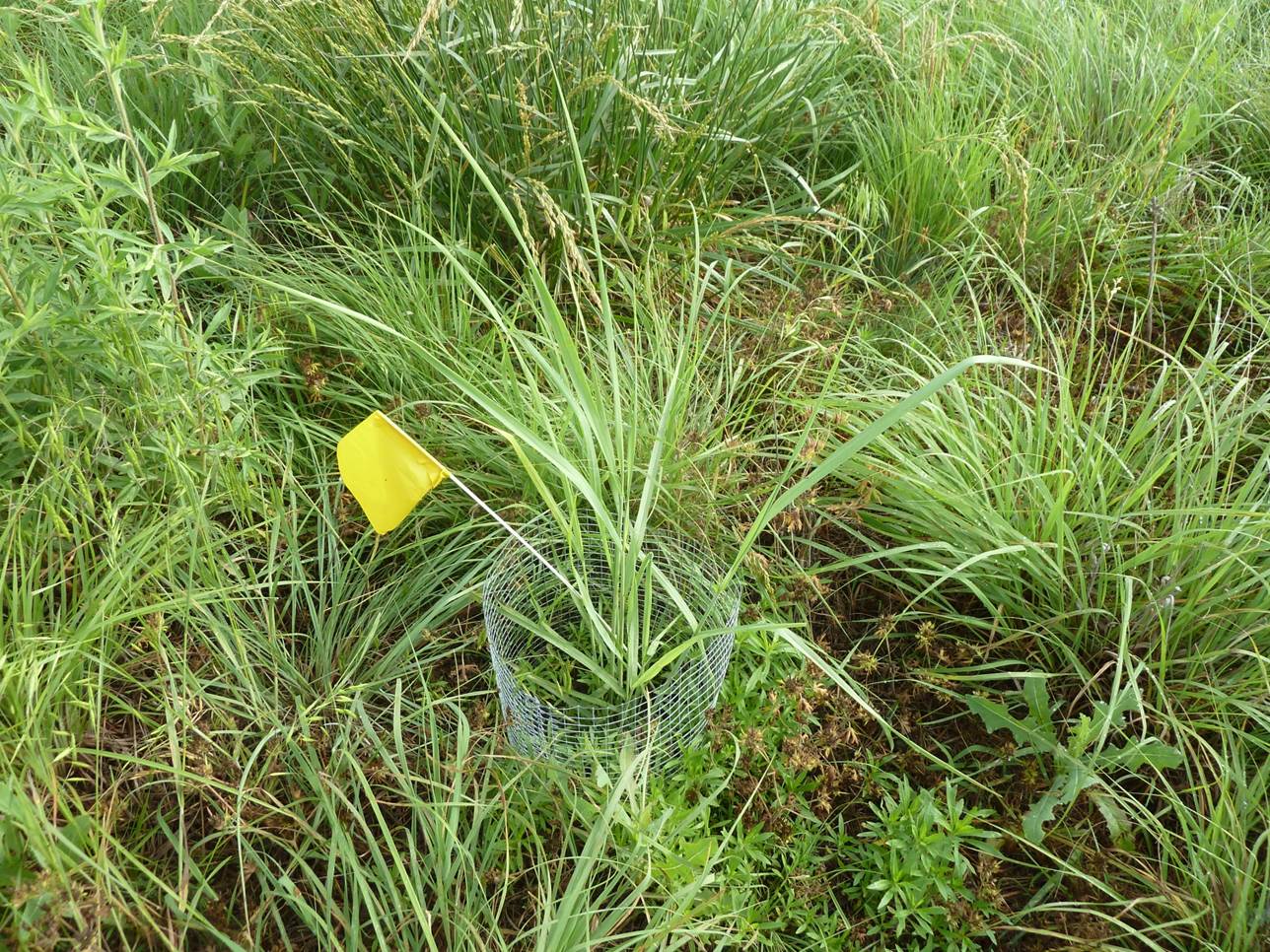 Transplanted plant of switchgrass (Panicum virgatum) in a field experiment examining fitness effects of virus infection. Photo: Helen Alexander,June 2013 (doi.org/10.1111/1365-2745.12723)