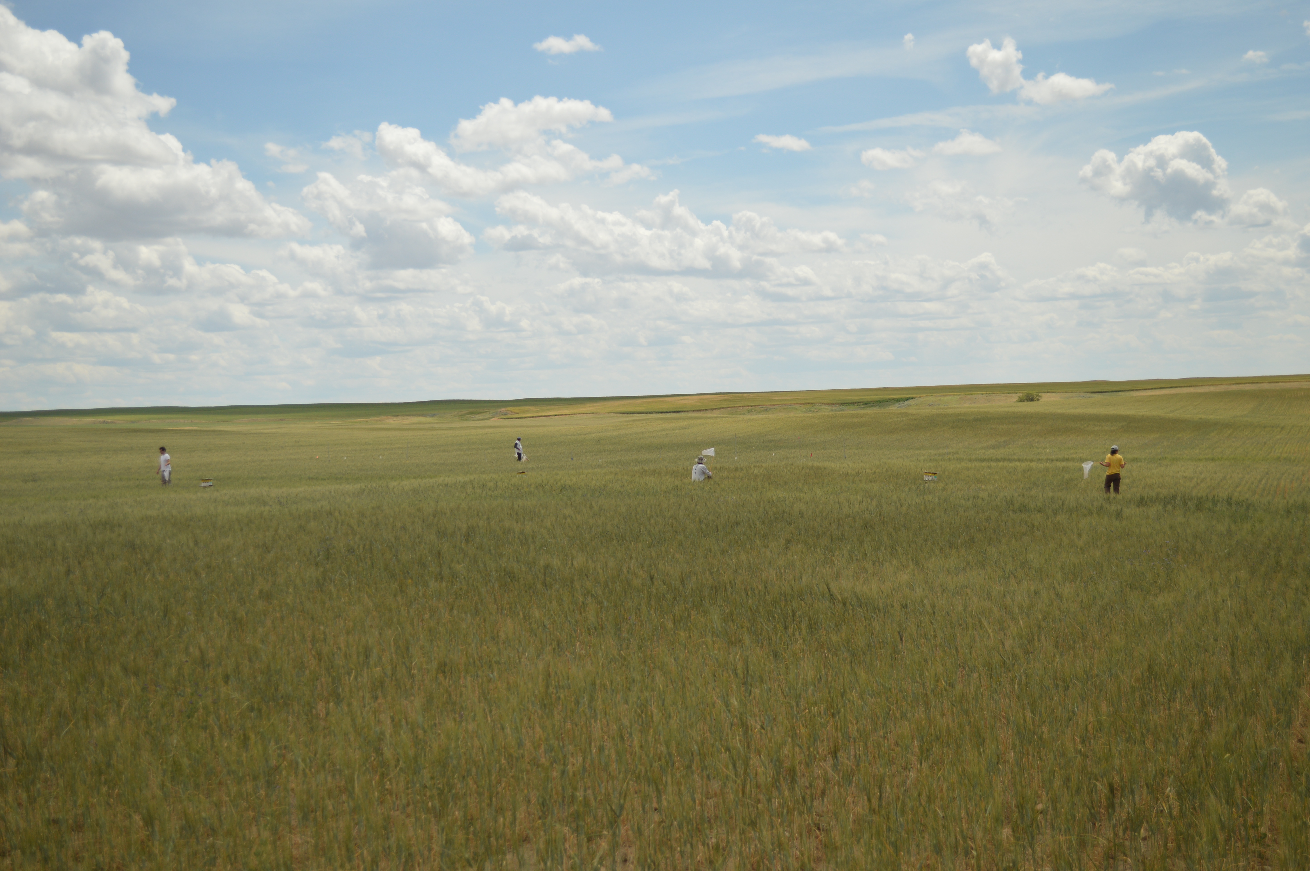 Field crew netting pollinators in a wheat field in Big Sandy, Montana USA. Photo credit: Subodh Adhikari (doi.org/10.1111/1365-2745.12784)