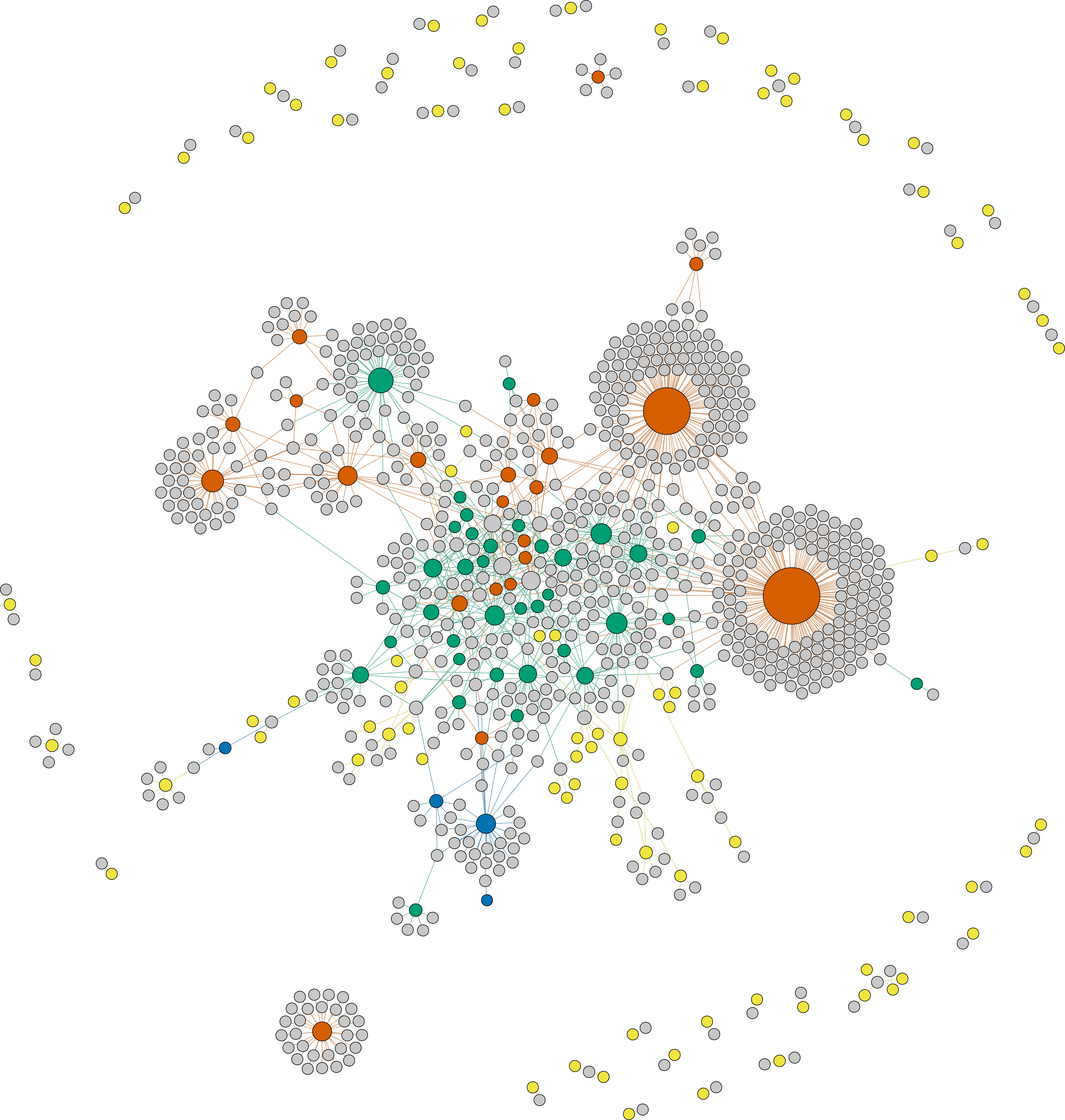 Figure 2. Representation of the orchid-pollinator interaction network. Circles correspond to orchid or pollinator species, their size being proportional to their degree. Vermillion circles represent nectar-producing orchids, bluish green circles food deceptive orchids, blue circles shelter mimics, yellow circles sexually deceptive orchids and grey circles pollinators.