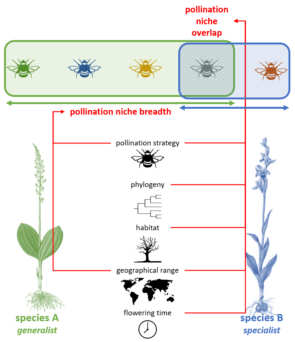 Figure 3. Summary of the factors affecting pollination niche breadth and overlap in Euro-Mediterranean orchids: example of Neottia ovata, a generalist nectar-producing species, and Ophrys apifera, a specialist sexually deceptive species.