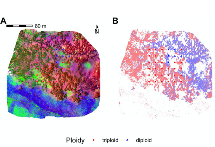In this study we examined the potential of remote sensing to detect variation in ploidy level across individuals and landscapes. The premise of the method is that genetic variation could drive phenotypic variation, which could then influence the spectral reflectance of different plant tissues (like bark and leaves). This reflectance variation could then be leveraged by a classifier algorithm. Previous studies have been able to use spectral data to successfully discriminate among species – the ambition here was simply to do discrimination of genetic variation within species.