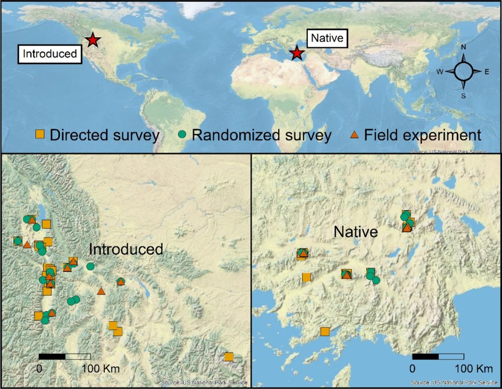 Map showing overlapping directed surveys, randomized surveys and field experiments in the native (Turkey) and introduced ranges (Montana, USA).