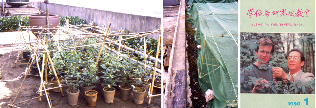 This research line started, in a way, during my PhD with Professor Marinus Werger at Utrecht University in the Netherlands. This work took me to China from 1989 to 1991. In the subtropical broad-leaved evergreen forest belt of SW China I did nursery experiments on the growth performance of different tree species in different light environments, trying to mimic the light conditions typical for different forest succession stages after gap formation. This was China when it was only at the very start of its incredible subsequent development in science and technology, so working conditions were physically tough. I had to find my way to the local street market to buy bamboo sticks for constructing frames and mosquito netting to tie over the frames to create different light regimes (photo 1a) below which I grew my little trees (photo 1b). With the generous help of colleagues and field assistants, under the kind wings of nationally renowned Professor Zhong Zhangcheng (photo 1c) at SW China University near Chongqing, I managed to germinate and grow a range of tree species from the various succession stages and measured their growth, leaf and root traits and biomass allocation in response to different light environments. In spite of practical and language constraints, and some disasters, I managed to complete my PhD thesis and published four papers from it, albeit not in journals of the impact that most readers of this blog would aim for nowadays. Journal of Ecology was still a dream, well beyond my level… However, this whole PhD period did set me up as a resourceful researcher not easily beaten by adversity. And it did leave me with a passion for China and its people that was permanent and would again become a big factor later on in my career.