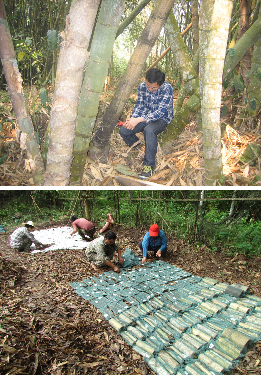 As I mentioned earlier, since my PhD time I have been very fond of China and, since 2006, have enjoyed ever increasing intensity and geographical breadth of collaboration with Chinese colleagues, without exception supported by wonderful hospitality when out there. I really like the way in which especially young Chinese scholars are so super dedicated and eager to learn and improve. My main job with my numerous own Chinese PhD students and postdocs in Amsterdam over the years, besides discussion about research ideas, designs and manuscripts, has always been to emphasize the importance of taking a break in the weekends and relaxing more to stay healthy. In this blog (see also chapter 3) I will only highlight a few China collaborations directly related to some of the Journal of Ecology papers based on them. With regard to deadwood decomposition, Guofang Liu (one of several bright young collaborators at the Institute of Botany, Beijing) and co-workers (advised by long-term research friends Ming Dong, Zhenying Huang, Kunfang Cao and Will Cornwell) carried out a large deadwood experiment comparing deadwood decomposability of (monocot) bamboos with that of (dicot) broadleaf trees in the beautiful tropical botanical garden of Xishuangbanna, in the deep south of China (photos 6). I have come to really appreciate the great additional benefit of botanical gardens (besides the obvious ones they are meant for) of serving as a “common garden” where all species grow in a similar climate and mostly also in rather similar soil; and generally the plants have labels with the correct species name. This is ideal for comparative studies on traits and carbon cycling including decomposition (which I will revisit in the next blog). It was easy for us to get permission for this work, as our massive sampling operation basically meant we were “cleaning up” the garden by removing its dead wood (of all our target species). Our team collected deadwood samples of various standard diameters, measured some of their key traits and incubated all samples, in litterbags, in a mixed forest leaf mould layer, i.e. a common garden litterbed again (see above). Our litter turned out to be also accessible to termites. The big story from this work (Liu et al. 2015, virtual issue) was not simply that, as hypothesized, bamboo wood decomposed generally more slowly than dicot wood because of its very tough dry matter. Excitingly, we found that the overall negative relationships between initial dry matter content or wood density and decomposition rates, across many bamboo and dicot species, were explained for about half by microbial respiration without termite interference, and for the other half by the preferences of termites for softer wood. This positive feedback, whereby termites amplify the relationship between wood quality and microbial decomposition rate, is very important to carbon cycling in warm-climate forests, given the great abundance of termites there. I may come back to this work in a subsequent blog, hereby announcing a cliff hanger about “celebrating disasters”.