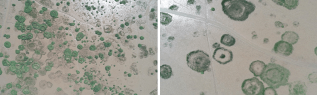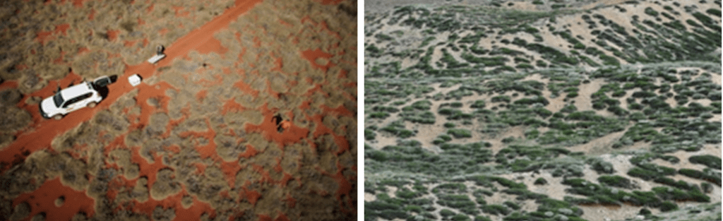 While one can use sophisticated experiments to study plant-plant interactions under well-controlled conditions, it is difficult to say how often and how strong these interactions are in natural ecosystems, especially at large spatial scales. For instance, would it be possible to tell if co-existing plants are mostly friendly or hostile to one another, just from a glimpse of the landscape, like in the cover image?