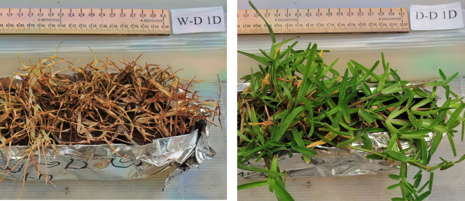 They used ingenious pot experiments to study this. In the first experiment, involving buffalo grass (Stenotaphrum secundatum), a stoloniferous turf grass, individual plants straddled pots, with roots in separate pots. In this way, drought treatments could be applied to part of one donor plant so that it could then “send” cues from the part rooted in a watered plot to another plant also rooted in that pot and straddling into another watered plot where another plant was growing. The authors refer to the first of these plants as being directly cued and the second, more distant plant, as relay cued. After cuing periods of either 1 or 5 days, the donor plants were removed and all receiver plants were then either droughted or watered for the rest of the experiment.