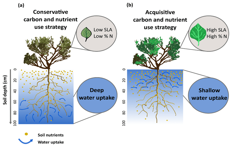 Our results suggested that a more acquisitive plant strategy along the LES may necessarily require the exploitation of resources from nutrient-rich shallow soil layers after rainfall pulses. In contrast, a more conservative carbon and nutrient use strategy may be advantageous to species depending on more stable and reliable water sources from deeper, nutrient-poor soil layers.