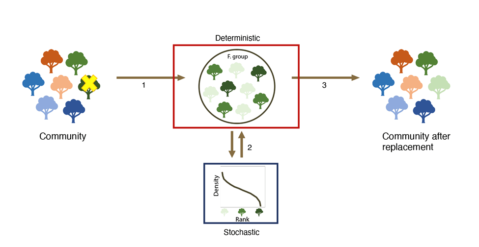 Ultimately, the results show that functionally similar species within groups likely replace each other in a random manner through time. These results highlight the importance of deterministic and neutral processes during the assembly of communities by understanding the important role of functionally similar species grouped into functional groups. Specifically, a continuum between these processes is essential to maintaining forest species richness and functionality.