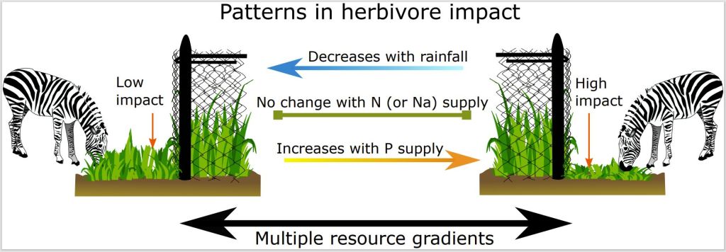We found that herbivore impact, measured as a ratio of plant biomass in fenced to biomass in unfenced plots, decreased with rainfall, increased with P availability, and did not change with N availability. This combination of patterns with different resources suggests that plant quality, in this case driven by plant P, was an important predictor of herbivore impact in the system.