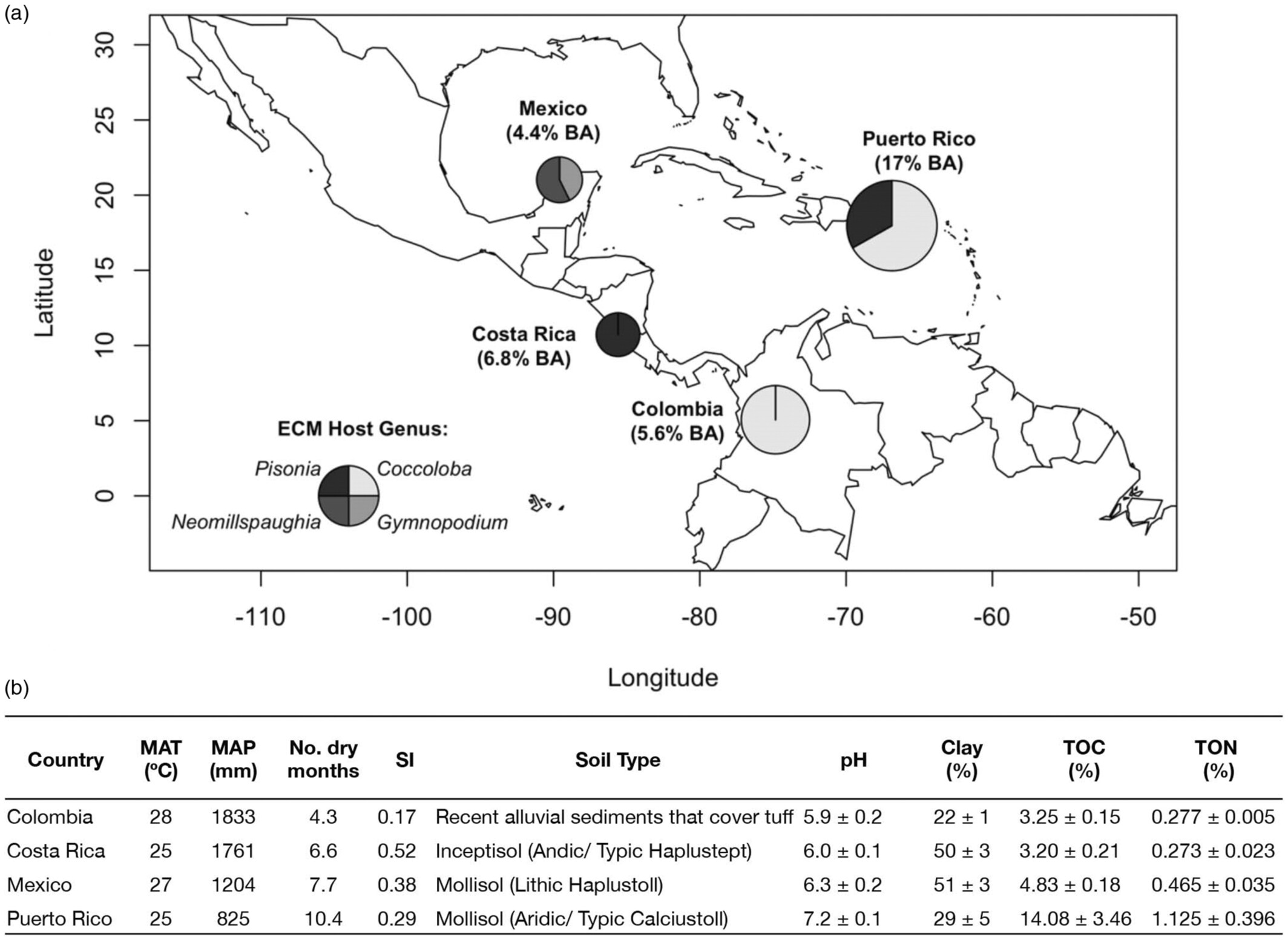 Seasonally dry tropical forests are characterized by a prolonged and severe dry seasons, during which many plant species are deciduous. Unlike wet forests, that tend to be relatively homogeneous (at least in climate), SDTF occupy a wide range climate conditions. The researchers exploited this variation, with dry seasons ranging from 4 to 10 months, by establishing similar permanent plots in Mexico, Costa Rica, Puerto Rico and Colombia. They then used identical protocols to sample ECM fungi from the soil and collected standardized data on climate, soil chemistry and vegetation. These datasets allowed them to assess how environmental variables and physical distance affected the composition of the ECM community, characterized by sequencing fungal ITS rDNA.