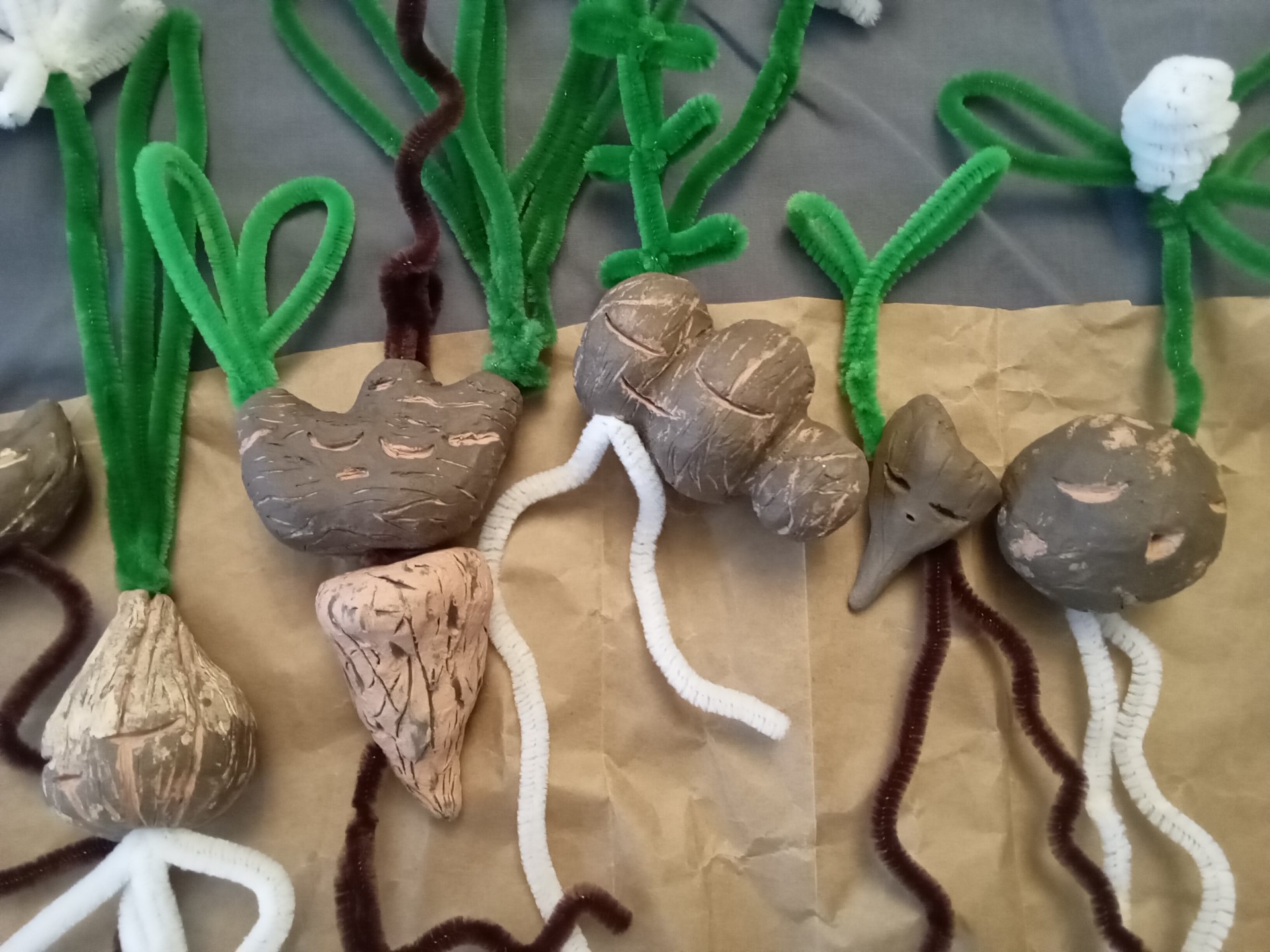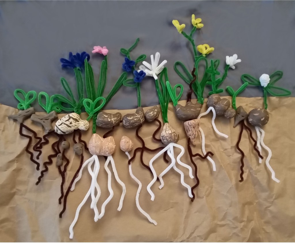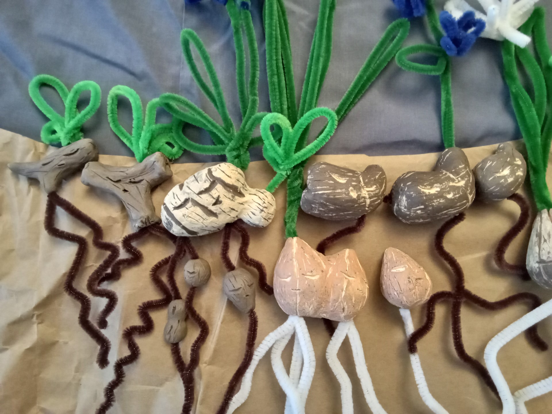 An assortment of perennial herb dolls. Storage organs/bodies are made of ceramics, with roots and foliage made of pipe cleaners. Herbaceous perennial plants keep their bodies (storage organs) belowground to persist through seasonal and recurrent disturbances. These organs are generally stem derived (such as rhizomes) or root derived (such as taproots) and contain water, carbohydrates, and other substances for regrowth and stress mediation. From left to right: root fragment, root fragment, epigeogenous rhizome with root tubers, bulbs, hypogeogenous rhizome, bulb, nonclonal plant with taproot, epigeogenous rhizome, root fragment, and stem tuber. For more details and examples, see ‘Temperate herbs: An architectural analysis’ by J. Klimešová, (2018).