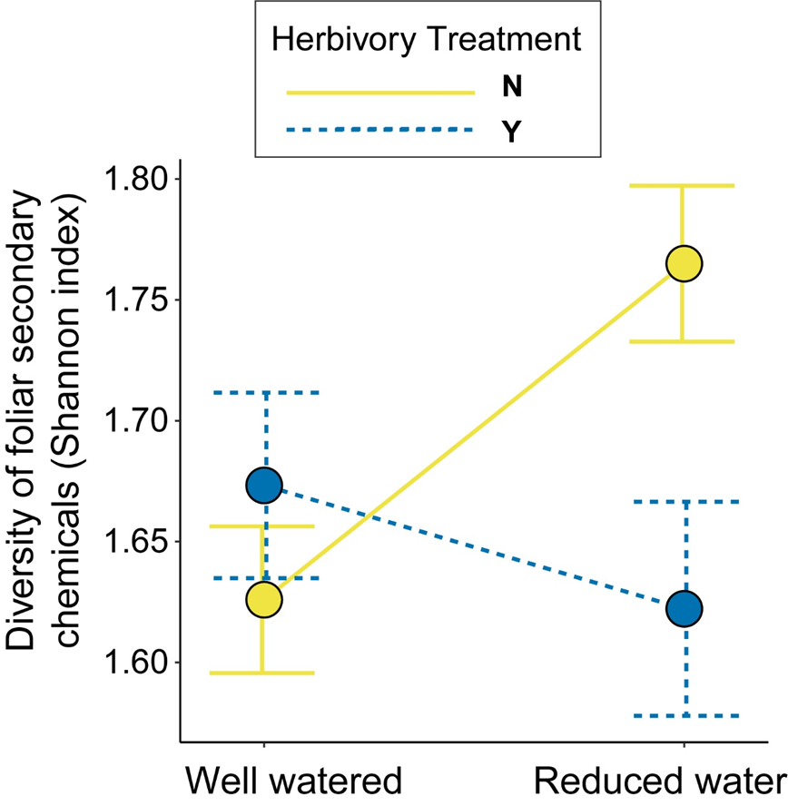 Our findings unveiled a nuanced relationship between plant traits, environmental stress, and herbivore pressure. When plants faced water limitation alone, they responded by increasing their water use efficiency, including narrowing their leaves and reducing aboveground biomass. Plants also altered the levels of secondary chemicals within their leaves, with a greater evenness in the relative abundance of flavonols. Herbivory alone led to an increase in the richness of chemical compounds. In both instances, these responses resulted in an increase in foliar chemical diversity. However, plants that experienced both water limitation and herbivory exhibited similar phytochemical diversity to well-watered control plants. This lack of plasticity in chemical diversity was associated with a reduction in relative growth rates.