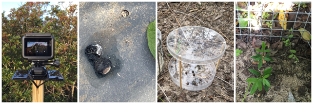 Our field experiments. From left to right: Go-Pro camera recoding a lentisc plant, close-up of faeces with P. lentiscus seed collected in a seed trap, a seed offering rodent predation experiment, a 1 year old seedling of P. lentiscus grown in one of our seed sowing experiments. Photo credits: Elena Quintero.