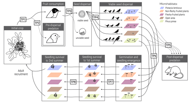This is figure one of our manuscript showing the different transition staged we measured for lentisc demographic cycle. TP1: probability of fruit consumption, TP2: probability of seeds escaping finch predation, TP3: probability of dispersing a viable seed; TP4: probability of viable seed being dispersed to a certain microhabitat, TP5: probability of dispersed seeds escaping rodent predation, TP6: prob. of seedlings emerging from surviving seeds, TP7: probability of seedling surviving its 1st summer and TP8: probability of seedling surviving its 2nd summer. Coloured rectangles represent distinct microhabitat types that differ in arrival of seeds and recruitment probabilities.