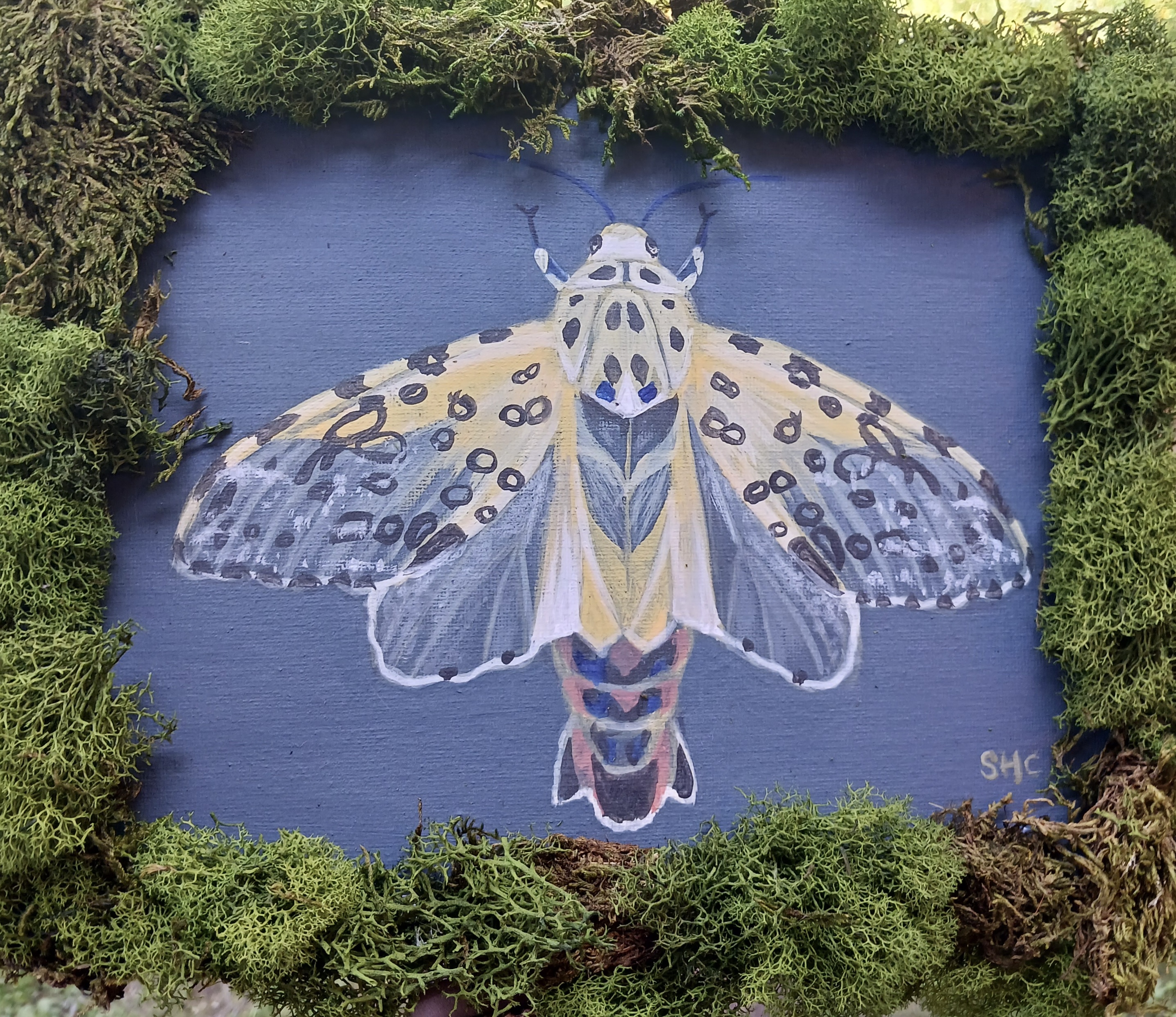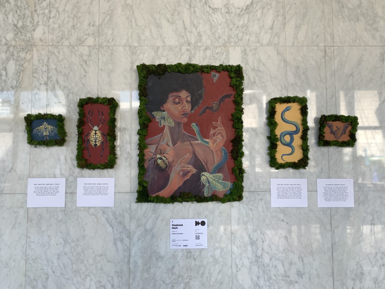 The remaining four paintings are detailed close-ups of species found in the main piece. They are displayed next to info cards on how we can conserve and protect these species best. A layer of preserved moss encroaches the edge of each canvas to emphasize how our existence is predicated by nature – regardless of whether we find every aspect of it appealing.