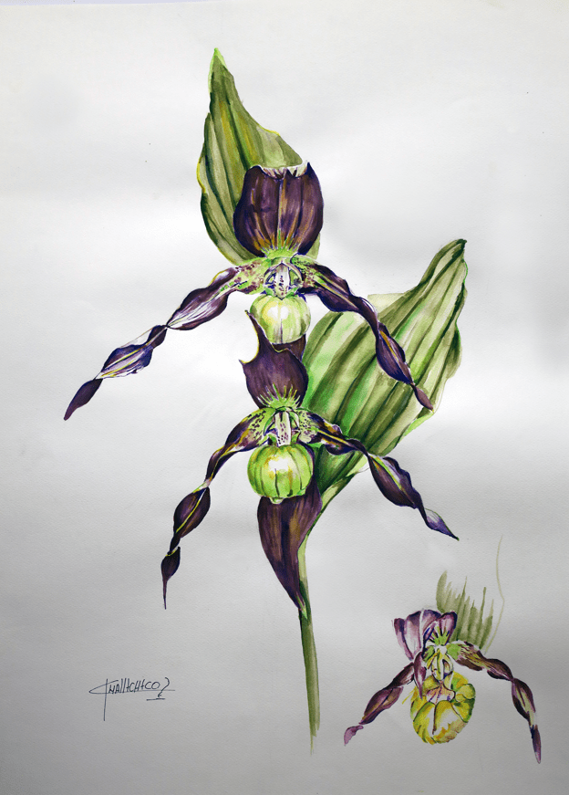 Venturing into Hungarian forests created an emotional connection, which was my motivation for expressing nature through watercolours. I chose this medium to portray the unique characteristics of various species, such as the exquisite lady’s slipper orchid, Cypripedium calceolus. This artistic endeavour aimed to capture the perfect harmony between the orchid and its environment, serving as a poignant reminder to preserve the rich floral diversity of the region.