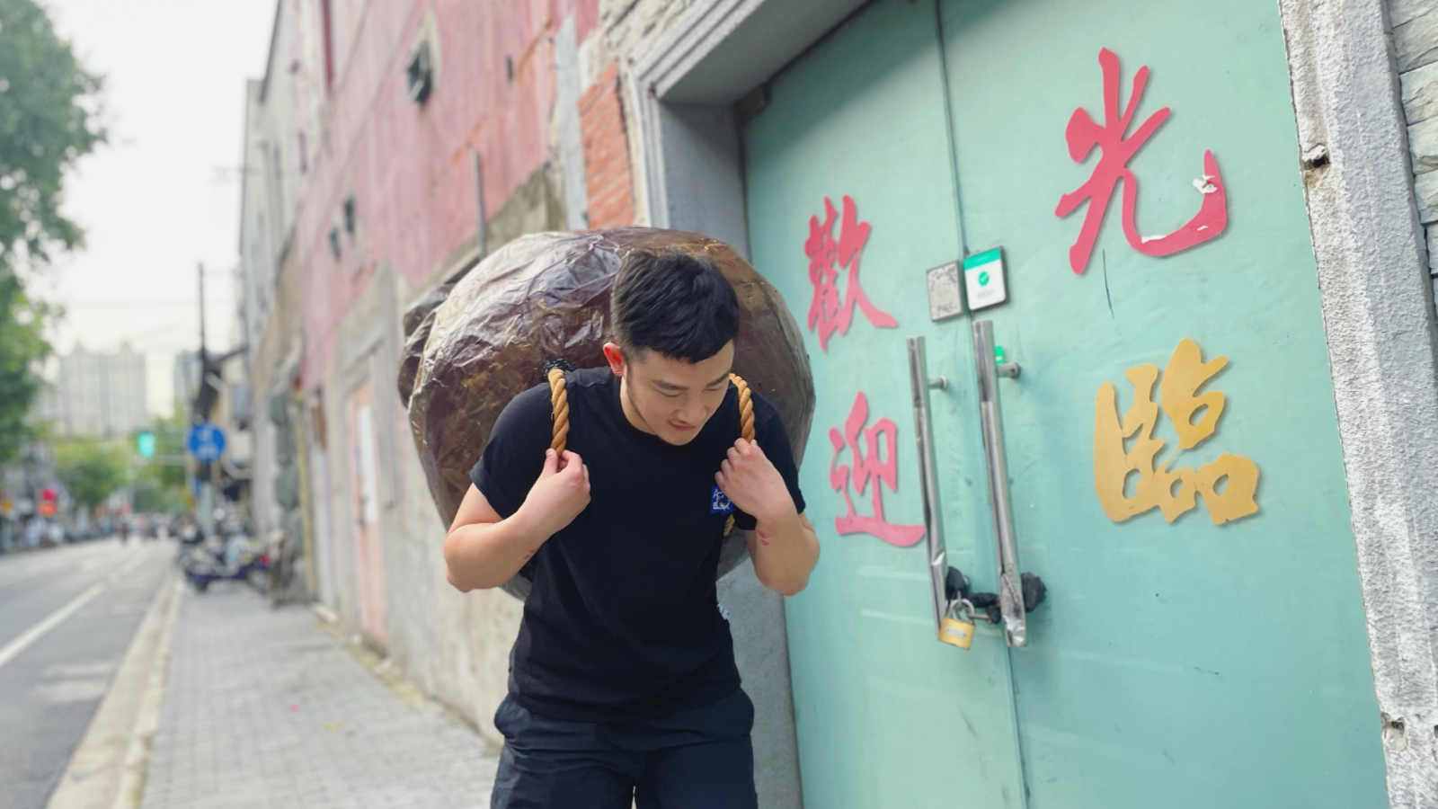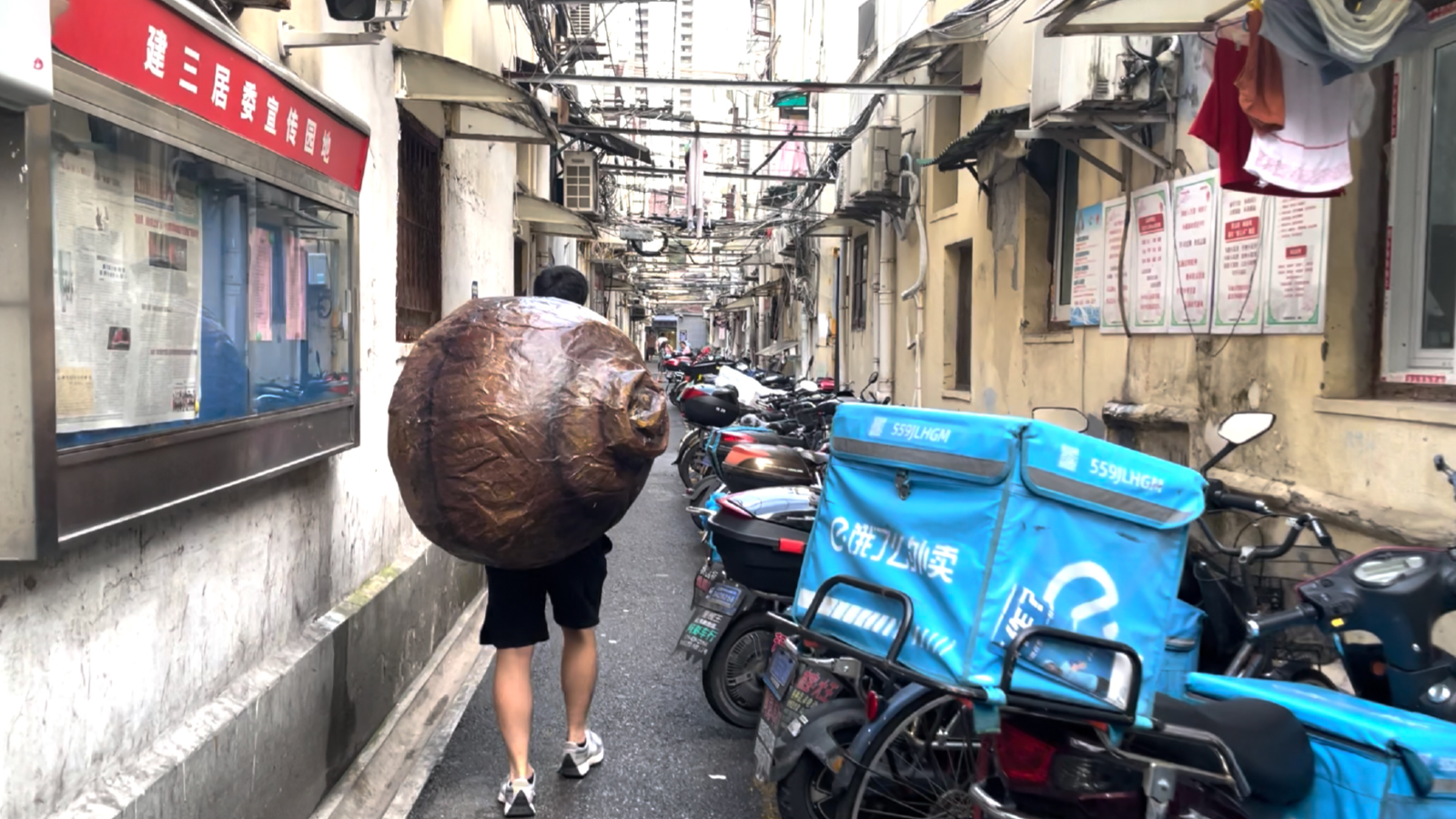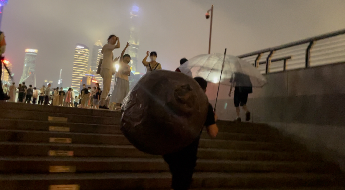 I interviewed some people living in Shanghai. Some of them were security guards, foreign trade workers, and ordinary white-collar workers to understand their living conditions. Then I made an installation that can walk on my back, and performed a walking performance art in a shabby old building in Shanghai and in Shanghai’s most prosperous areas, to reflect the current life of people in big cities.