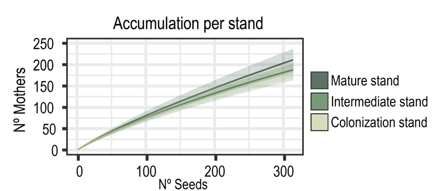 Over two years, we sampled the seed rain in three stands along this expansion gradient. Additionally, we were aware that frugivore-generated seed rain can be structured based on the microhabitats that animals choose or avoid for feeding, perching, or protection. For this reason, we sampled seed rain under five different microhabitats: pine trees, Juniper trees, fleshy-fruited shrubs, dry-fruited shrubs, and open area soils. The sampling was conducted in three stands across the maturity gradient: mature stand, intermediate-maturity stand, and colonization front stand.