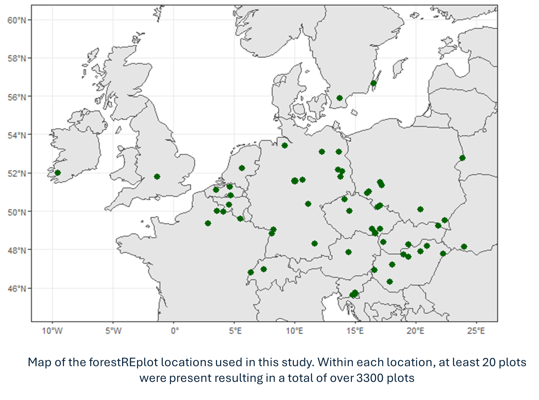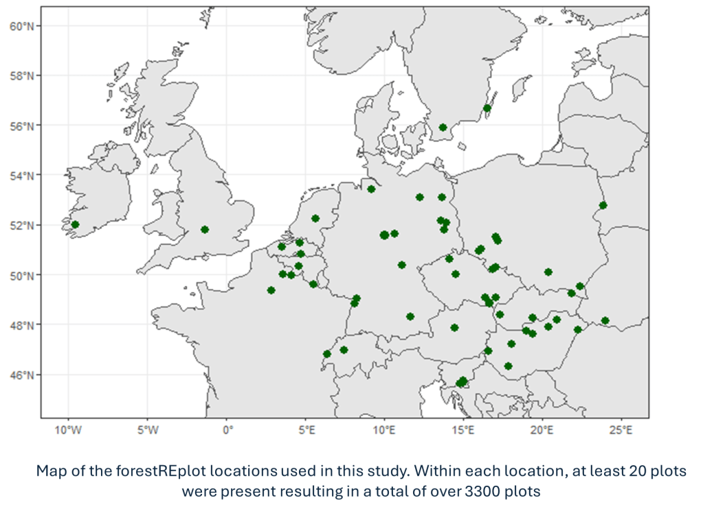 Firstly, we looked at present-day herb layer communities and how the nectar availability they provide varies throughout the year. Then, we quantified how nectar availability has changed over decades. Finally, we combined the two patterns, and looked at how the availability throughout the year has changed over decades. Our work used vegetation resurvey studies. These are studies where herb layer vegetation cover was recorded for at least two points in time at (more or less) the exact same location. We used data from the forestREplot database, covering over 3300 of such resurvey plots. To this database, we added data on nectar production for each plant species, resulting in the first quantification of nectar availability in the forest herb layer. Important to note here is that we estimated the potential nectar production per plot rather than measure the actual nectar production, for instance because we had no data on how many of the plants present were actually flowering.