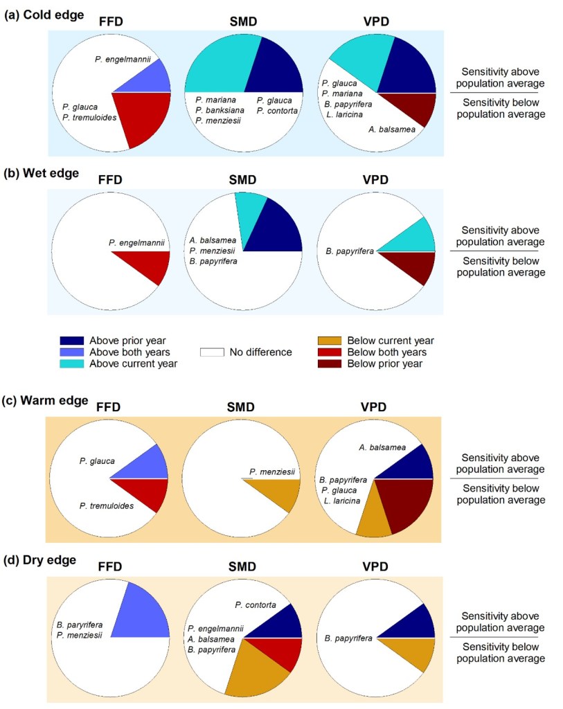 In many cases, however, climate sensitivity had a random distribution across subcontinental climatic gradients. For species with extensive ranges, like Picea mariana, Picea glauca, Populus tremuloides, and Pinus banksiana, there was insufficient evidence to suggest increased sensitivity to soil moisture deficit at the warm/dry limit of their range. And only half of the studied species displayed evidence of gradients in sensitivity to freeze. Our results provide indications of phenotypic acclimation or local genetic adaptation concerning growth sensitivity to the long-term mean climate.