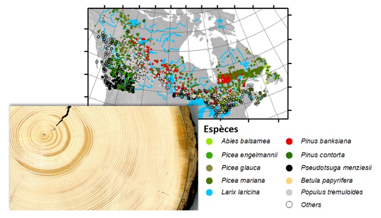 Notre étude exploite les données sur les cernes de croissance pour analyser la sensibilité climatique hétérogène des espèces dans les forêts du Canada, éclairant leurs interactions avec les gradients environnementaux et fournissant une base solide pour tester les prédictions biogéographiques. Dans notre article, nous avons examiné la capacité des espèces à ajuster leur sensibilité climatique aux conditions climatiques locales à l’aide d’un ensemble de données étendu sur les cernes de croissance de plusieurs espèces couvrant les forêts du Canada : 35 784 arbres de 57 espèces provenant de 4 535 sites. En utilisant des modèles à effets mixtes, nous avons quantifié les relations entre les accroissements des cernes de croissance radiaux et la fréquence des jours de gel, le déficit en humidité du sol et le déficit en pression de vapeur. Ensuite, nous avons exploré les facteurs favorisant les motifs observés de croissance annuelle et de sensibilité climatique tels que l’espèce, le climat régional et les conditions locales du site, ainsi que l’âge et la taille de l’arbre. Notre objectif principal était de comprendre comment la sensibilité climatique des arbres varie de manière fluide en fonction des covariables de la température annuelle moyenne et de la précipitation annuelle moyenne. L’hypothèse postule que les effets de ces covariables sont perceptibles aux limites froide/humide et chaude/sèche des distributions d’échantillons des espèces d’arbres.