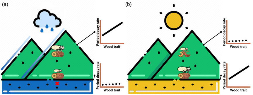 It is stressed that spatial and temporal variation of environments can directly shift optimal trait values and thus change ecosystem functioning. It is far less acknowledged that environmental changes may indirectly change and even reverse the trait-function relationship. As the first study to address the environmental dependency of the wood trait-decay relationship, we posited that unfavorable environments can suppress decomposer activities and weaken the wood trait-decay relationships. More specifically, waterlogged soils in valleys during the rainy season may decrease termite activities and wood decomposition rates, especially of palatable deadwood species. By comparison, wood trait-decay relationships could be less affected at ridges and hilltops during the rainy season.