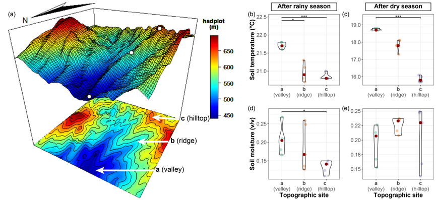 We found that termite feeding activities and wood mass loss during the rainy season were decreased by soil waterlogging in the valley but not on the ridge or hilltop. Wood density predominantly controlled termite feeding activities and wood mass loss, but its negative effects appeared at the ridge and hilltop only during the rainy season, and in the valley only during the dry season. Notably, warmer soil temperatures in the valley accelerated termite activities during the dry season, causing similar final wood mass loss as higher-elevation sites.