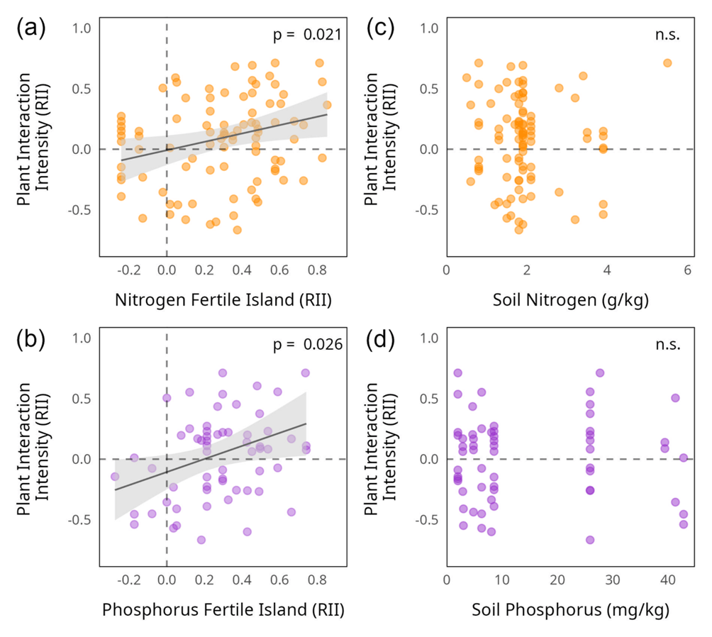 According to our first hypothesis, the intensity of facilitation was positively associated with the strength of the fertile island effect. However, contrary to our second hypothesis, facilitation intensity was not related to ecosystem fertility. Therefore, facilitation intensity increases as the difference in soil N and P concentrations between nurse and open microsites becomes more pronounced, independently of overall ecosystem fertility.