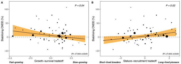 In tropical trees, two trade-offs are especially important. The growth-survival trade-off contrasts fast-growing species that have high mortality with slow-growing species that have low mortality. The second major trade-off is the stature-recruitment trade-off, contrasting tall, long-lived pioneer species with shorter-lived species that invest heavily in recruitment. We wanted to know whether these life-history strategies, especially the more recently described stature-recruitment trade-off, could explain why some species experience stronger conspecific negative density dependence than others.
