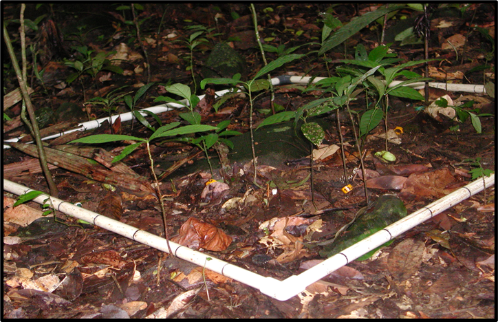 Seedling plots in the Barro Colorado Island, Panama. A 1 × 1 m plot with a PVC frame (left) and tagged seedlings (right). Photo: Liza Comita.