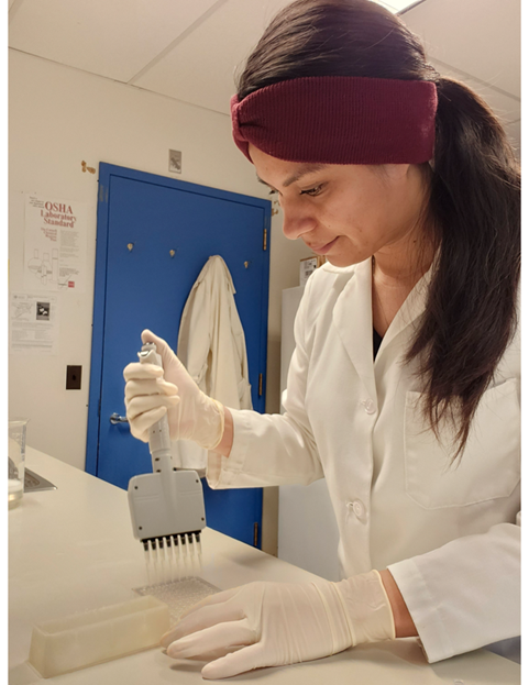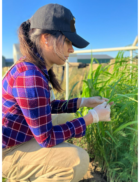 Sampling grasses in the field (left) and testing grass samples from the field for barley yellow dwarf virus infection using Double Antibody Sandwich Enzyme Linked Immunosorbent Assay (DAS-ELISA) in the lab (right). Photos by Alan S. Hinojosa.