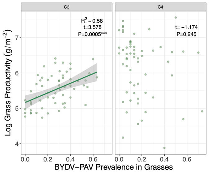 We found that, despite barley yellow dwarf virus (BYDV-PAV) infection levels varying significantly among study years, neither plant functional composition nor richness mitigated or amplified virus infection consistently across both study years. We found that species varied in their overall virus infection levels and net production. We also found that there were positive, neutral, and negative relationships between community-level virus prevalence and species’ net production. These findings reflect varying virus susceptibility and competence among hosts. Surprisingly, at the functional group level, we found that there was a strong positive correlation between community-level virus prevalence and net C3 grass production, in contrast to a neutral relationship between community-level virus prevalence and C4 grass production. Further, we found that net grass production was not correlated with community-level BYDV-PAV prevalence, suggesting that grass production likely contributed to variation in virus prevalence but likely did not drive community-level virus prevalence.