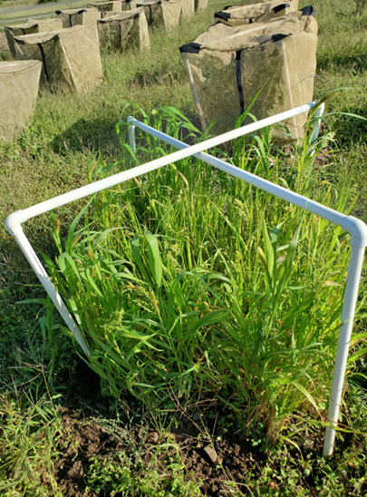 The experimental set-up at the Homer C. Thompson Research Farm in Freeville, New York (top). A community with just C4 grasses (bottom left). A community with C4 grasses and forbs (bottom right). Photos by Beatriz A. Aguirre.
