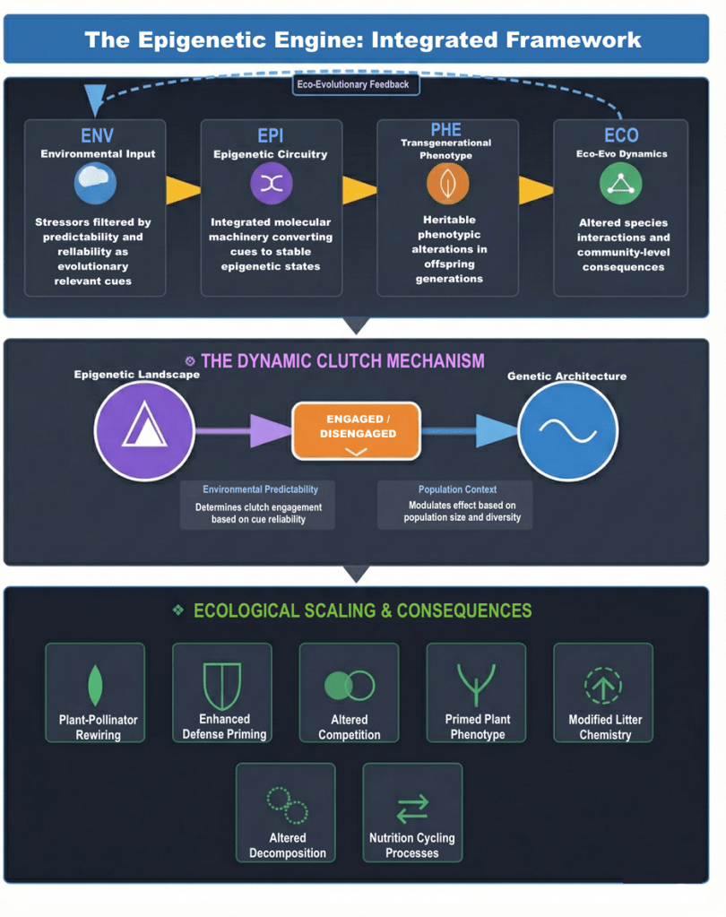The “clutch” metaphor comes from engineering—it engages or disengages power transfer. Here, epigenetic inheritance acts as a coupling between short-term survival and long-term evolution. When a population faces sudden climate stress, epigenetic buffering can maintain viability long enough for beneficial genetic mutations to arise and spread. A recent study on marine copepods exposed to warming and acidification found that epigenetic changes preserved genetic diversity during the initial crisis, allowing natural selection to later fix beneficial alleles once conditions had stabilized. In plants, heat-stressed Arabidopsis populations showed similar patterns: multigenerational exposure to high temperatures generates both epigenetic and genetic variation, with epigenetic changes appearing first and potentially paving the way for genetic accommodation. The clutch “engages” epigenetic memory during a crisis, then “disengages” to let genetics take over.